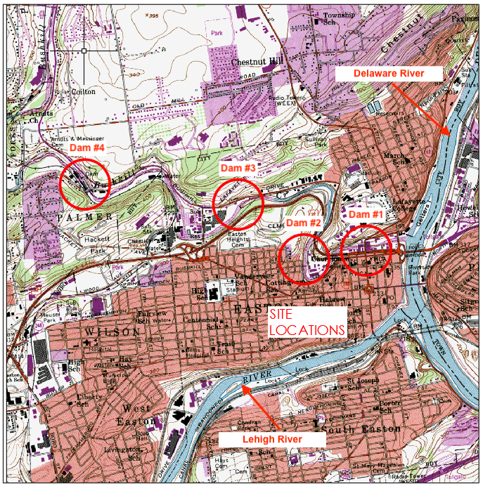 The map below shows the locations of all four dam removal locations on the Bushkill Creek: