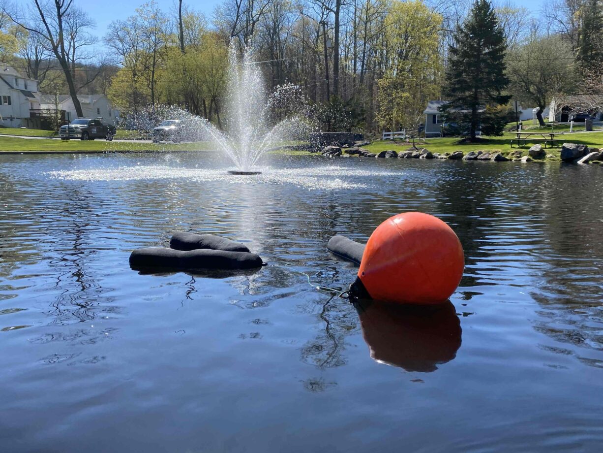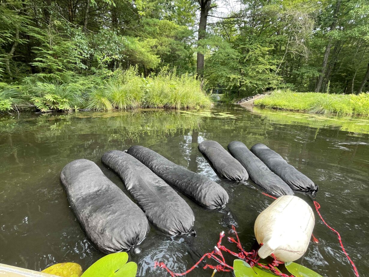 At Lake Hopatcong, New Jersey’s largest lake, biochar was deployed as part of a comprehensive, multi-pronged strategy to reduce nutrient concentrations and mitigate HABs. Biochar was installed in permeable flotation bags and placed at targeted shoreline and inlet locations where nutrient loading is most pronounced, including several stormwater inlets and outlets around the lake. Funded through the NJDEP Freshwater HABs Prevention & Management Grant Program and implemented in partnership with the Lake Hopatcong Commission and the Lake Hopatcong Foundation, these installations complemented other in-lake management measures such as floating wetland islands.
