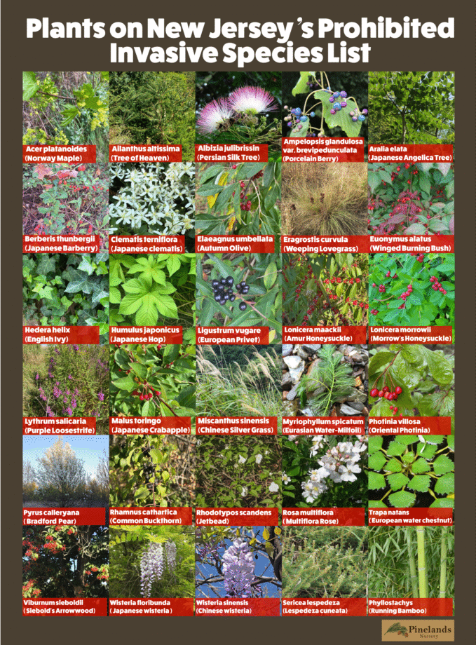 A curated visual guide, created by Pinelands Nursery, illustrates the invasive plant species included in the first phase of implementation under New Jersey’s new law: